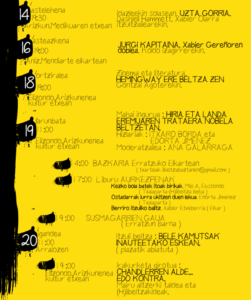 Hilaren 14tik 20ra izango da aurtengo (H)ilbeltza eta ekitaldi ugari antolatu dituzte. Horien artean daude Itxaro Borda eta Edorta Jimenez idazleen eskutik Hiria eta landa eremuaren trataera nobela beltzetan gaia izango duen mahai ingurua edota Hemingway ere beltza zen izenpean, zinema eta literaturaren gaineko hitzaldia Gontzal Agoterekin, besteak beste.