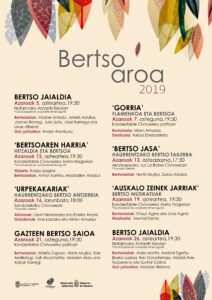 Nafarroako Bertsozalek iragarru duenez, bertsogintza ardatz duten askotariko emanaldiak bilduko ditu aurtengo Bertsoaroa zikloaren egitarauak, bertsoa publikoarengana molde ezberdinetan gerturatzeko asmoz. Oraingoan, gainera, bi estreinaldi jasoko dira: Lehena, Gorria, Miren Amuriza bertsolariaren eta Askoa Exebarrieta dantzariaren proiektua da, bertsolaritza eta flamenkoa lotzen dituena. Pasa den urtean Lanku beka irabazi zuen proiektuak (orduan, Tan takatan izenarekin), eta Iruñekoa izango da publiko aurreko lehen emankizuna. Bigarren estreinaldia berriz, haurrentzako Urpekakariak antzerki obra izango da. Lierni Hernandez eta Eneko Arrate aktoreek gorpuztuko dute Ane Labakak eta Miren Amurizak idatzitako istorioa.