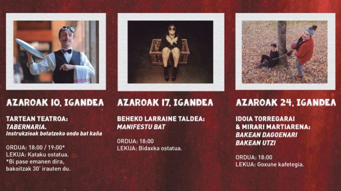 Hilaren 17an, igandea, berriz, Beheko Larraineren Manifestu bat antzezlana ikusteko aukera egongo da Bidaxka ostatuan, arratsaldeko 18:00etan. Miren Tirapu aktorearen eskutik, beti bazterreko pertsonaia bat baino izan ez denak, azkenean, arreta bereganatuko du obra honetan. Bere barne-ahotsek behingoagatik, begirada guztien erdigunera bultzatuko dute. Bueltan, bere begirada itzuliko digu. Nolako begirada, halako errealitatea. Begirada ironikoa heriotzari bizitzaren gorabeherak erakutsiz.
