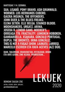 Aurretik Gernikako Lekuek festibalean joko dituzten talde batzuen izenak aurreratu badituzte ere, orain itxi dute antolatzaileek Gernikan urtero ospatzen den musika jaialdiaren kartela. Lisabö, Sua, Los Hermanos Cubero, Urgatz, Arima, Joseba B. Lenoir eta Wormed taldeek osatzen dute, besteak beste, egitarau oparoa. “Martxoaren 7tik 14ra, Gernikako hainbat espazio eta plaza hankaz gora jarriko dituzten taldeen izenak dira hauek, mimo guztiarekin aukeratu ditugunak”, nabarmendu dute.