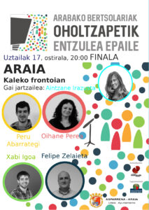 Saioa amaitu baino lehen, agurrak kantatu aurretik heldu zen ikuslearen epaia, bertsolari bakoitzari txalo zaparrada eskaintzeko unea. Eta entzuleek hala erabakita Xabi Igoa izango da, uztailaren 17an, Araiako kaleko frontoian kantatuko duen bertsolaria Felipe Zelaieta, Peru Abarrategi eta Oihane Perearekin batera.