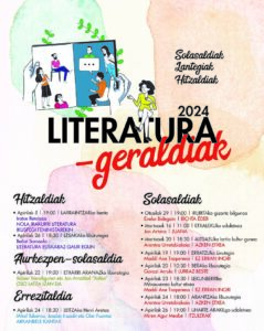Guztira hamabi ekitaldi antolatu dira, gehienak literatura solasaldiak, aurkezpenak, errezitaldiak, eta baita hitzaldiak ere. Literatura solasaldiei dagokienez, otsailaren 29an, osteguna, izango da lehena Eneko Bidegainen eskutik. Maddi Ane Txoperena, Jon Artano, Arantxa Urretabizkaia eta Miren Agur Meabe idazleak dira solasaldi hauetan parte hartuko duten beste idazleetako batzuk.